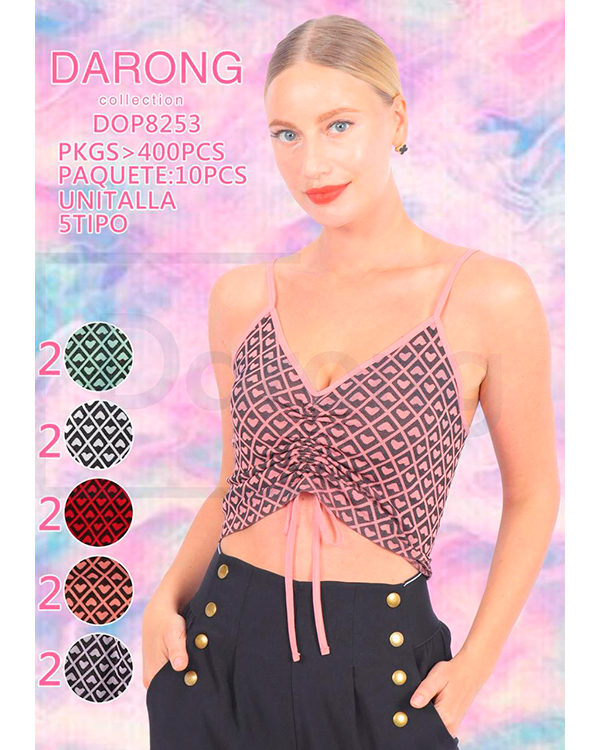 | Descripción | Top de tirante con estampado y con ajustador en parte delantera |