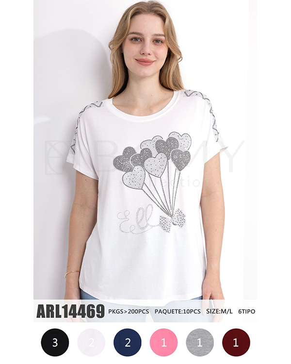 | Descripción | Blusa manga corta de cuello redondo con aplicación de corazones y detalle en hombro |